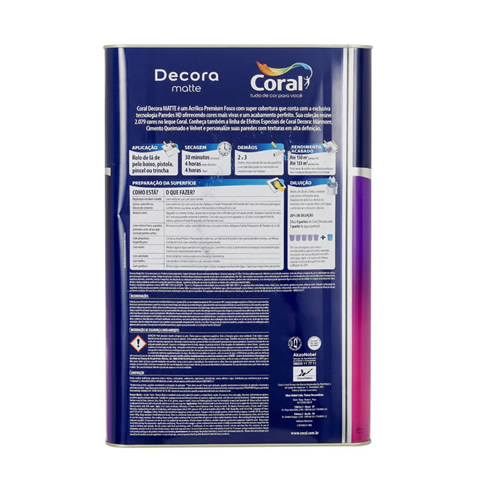 Decora MATTE é um Acrílico Premium Fosco com super cobertura que conta com a exclusiva tecnologia Paredes HD oferecendo cores mais vivas e um acabamento perfeito. Sua coleção reúne 2.079 cores no leque Coral. Rende até 150m² acabados por embalagem de 18LT.